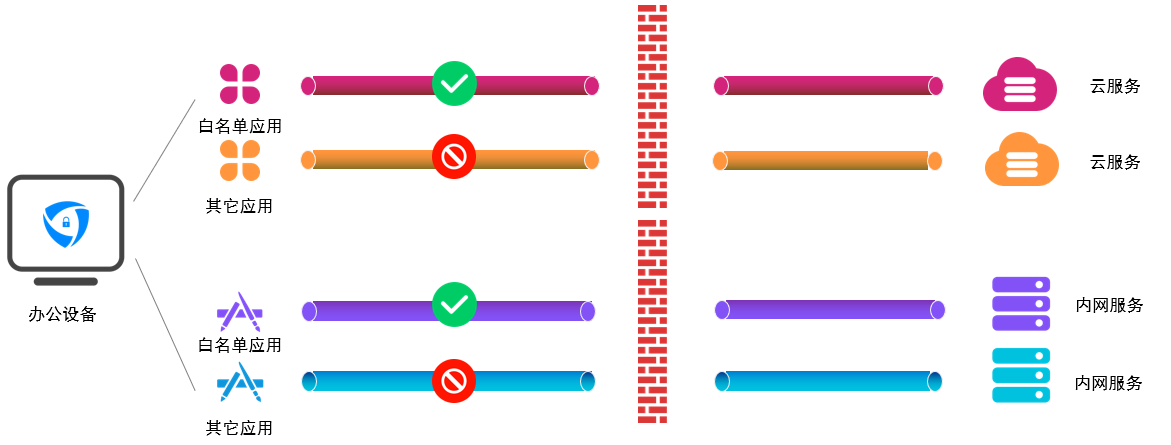 云涌零信任系統始終保證僅“合法”的本地應用才能訪問內網服務。只有經過管理員授權的應用進程才可以通過TLS隧道傳輸數據。系統將應用與服務綁定,提高服務訪問的安全性。