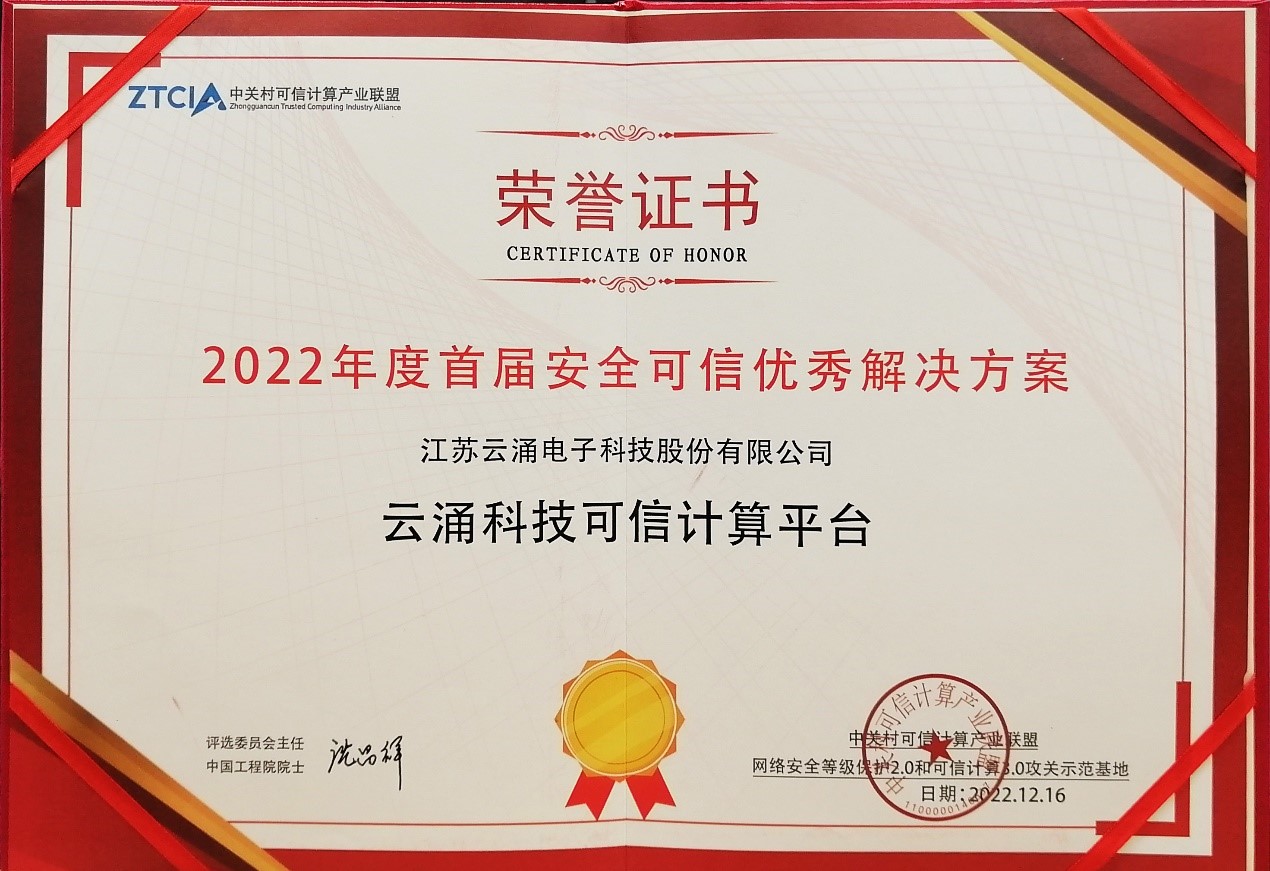 云涌可信計算平臺榮獲首屆安全可信解決方案獎