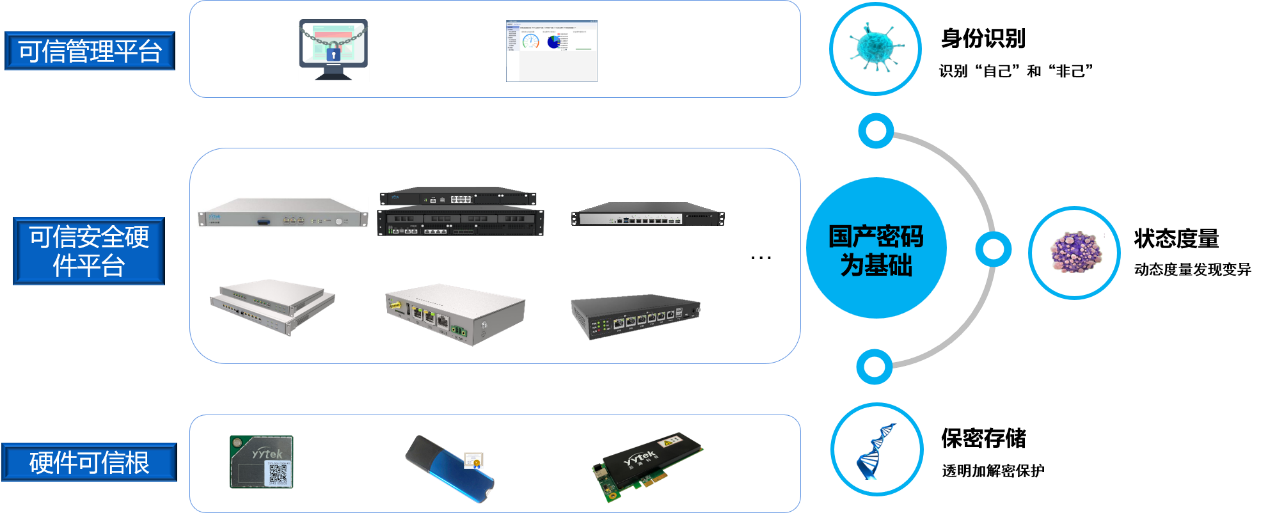 云涌可信計算平臺以可信計算為核心技術,采用“計算+保護”雙體系結構,對通用計算部件(包括通用硬件和固件、操作系統、應用軟件及服務)進行度量和控制,為現有系統構建可信環境,實現自主防御,抵御未知木馬、病毒以及0day攻擊。此外,云涌還基于可信計算核心思想和基本架構,依據等級保護2.0要求,結合自身在工控安全領域多年來的軟硬件技術積累,打造出硬件可信根和可信安全硬件平臺等系列產品,全面守護底層到硬件層,乃至應用層的系統安全。