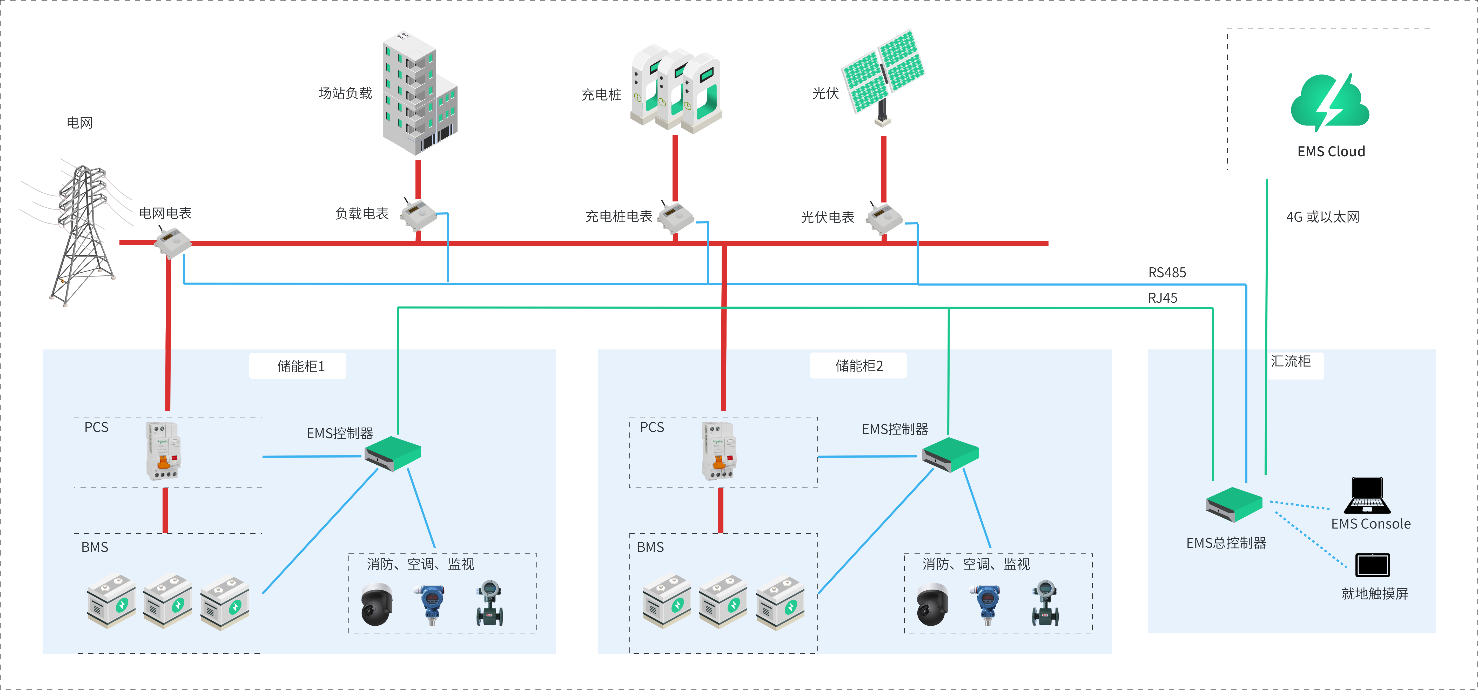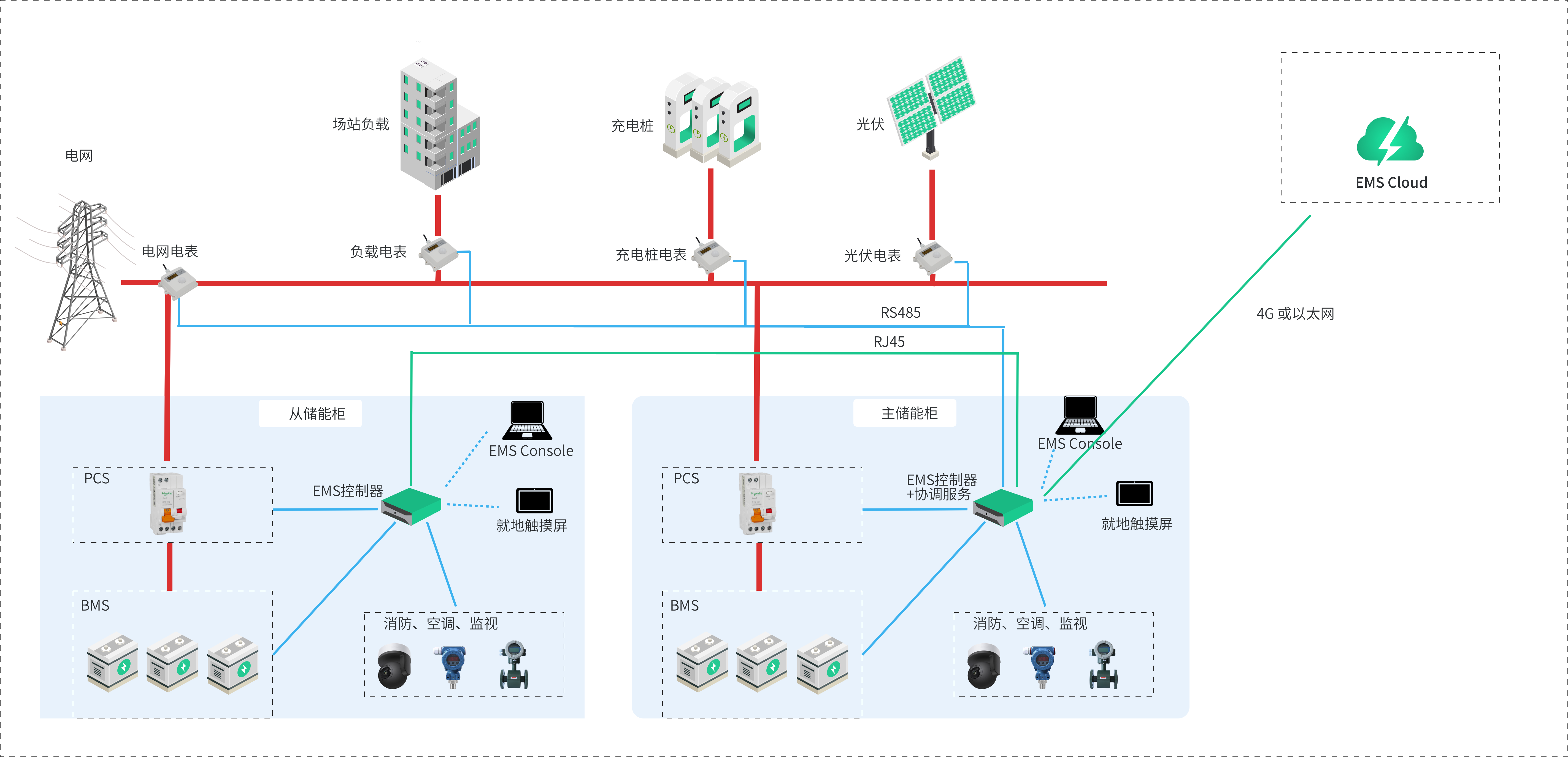 所有柜體內(nèi)只有一個控制器,并放置于主柜中,主柜EMS控制器通過以太網(wǎng)與所有從柜進(jìn)行通訊交互,從柜中安裝采集或者轉(zhuǎn)換裝置,用于在主柜控制器與從柜各組件設(shè)備之間做數(shù)據(jù)轉(zhuǎn)發(fā)。