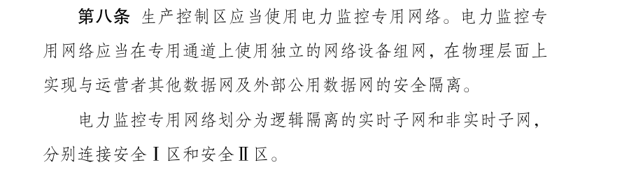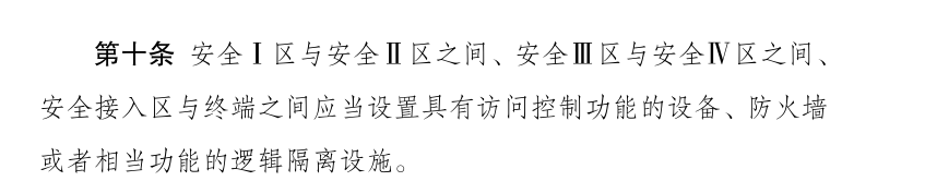 ? ? ? ? 其中第八條和第十條首次提出了邏輯隔離的概念,提到生產(chǎn)控制區(qū)應(yīng)當(dāng)使用電力監(jiān)控專用網(wǎng)絡(luò),劃分為邏輯隔離的實(shí)時子網(wǎng)和非實(shí)時子網(wǎng),分別連接安全Ⅰ區(qū)和安全Ⅱ區(qū);安全Ⅰ區(qū)與安全Ⅱ區(qū)之間、安全Ⅲ區(qū)與安全Ⅳ區(qū)之間、安全接入?yún)^(qū)與終端之間應(yīng)當(dāng)設(shè)置具有訪問控制功能的設(shè)備、防火墻或者相當(dāng)功能的邏輯隔離設(shè)施。