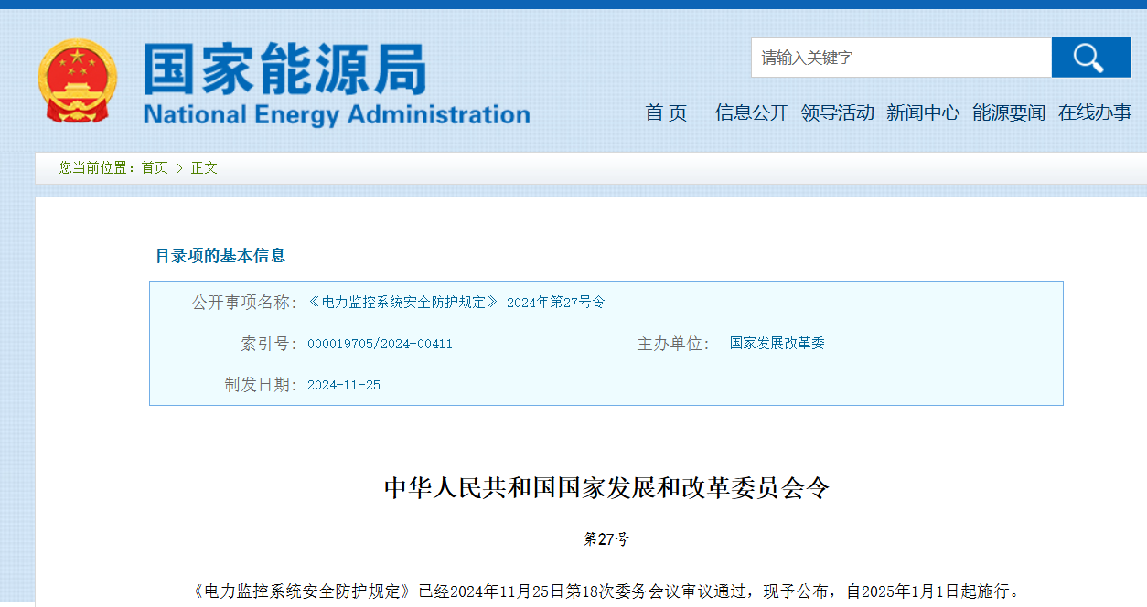 ? ? ? 近日,國家發(fā)展改革委頒布了新修訂的《電力監(jiān)控系統(tǒng)安全防護(hù)規(guī)定》(國家發(fā)展改革委2024年第27號令,以下簡稱27號令),自2025年1月1日起施行,原《電力監(jiān)控系統(tǒng)安全防護(hù)規(guī)定》(國家發(fā)展改革委2014年第14號令,以下簡稱27號令)同時廢止。