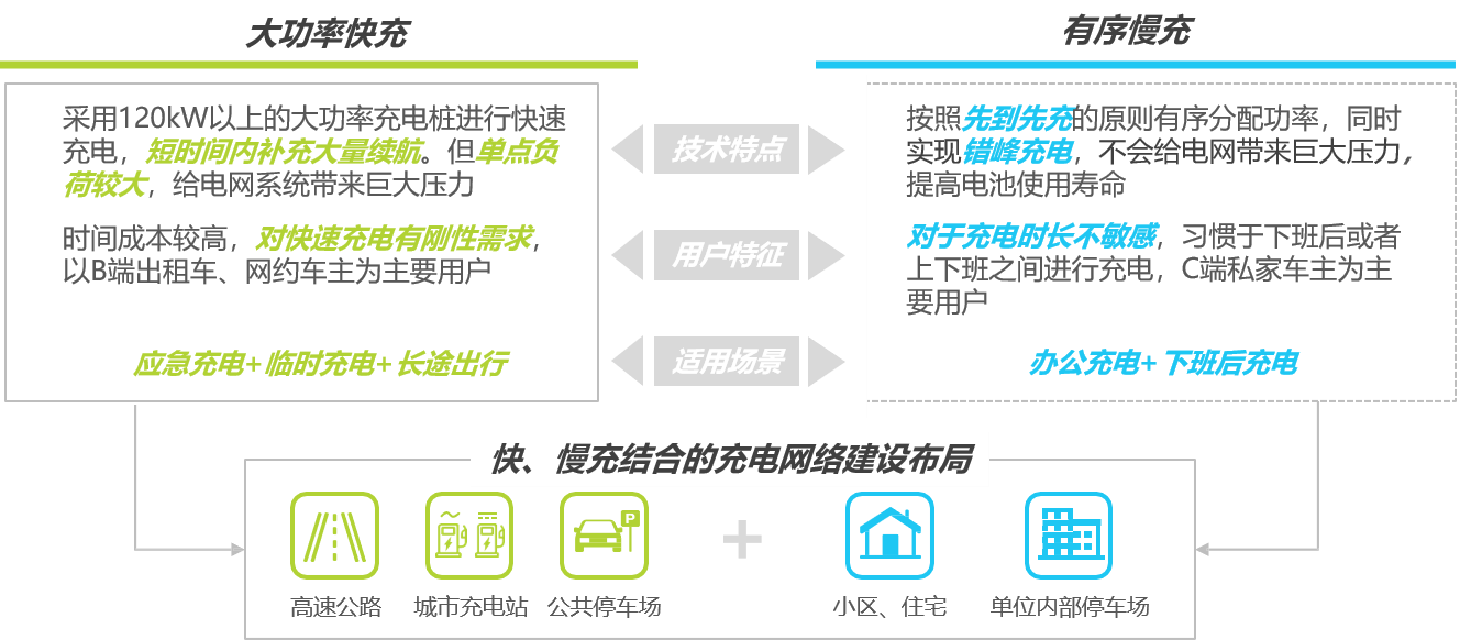 充電模式的有效發展:大功率直流快充成為剛需,充電難并不僅僅局限于充電基礎設施的數量與分布上,如何有效提高充電效率同樣重要,大功率快充和有序慢充體系的結合為未來充電模式的發展方向。